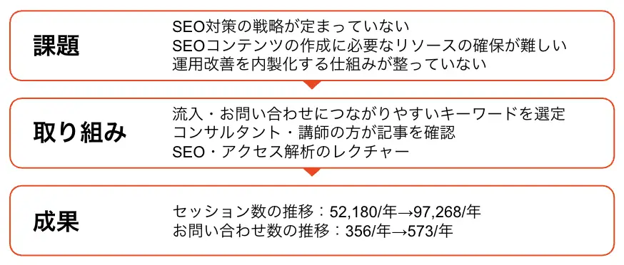 「SEO対策の戦略が定まっていない」や「運用改善を内製化する仕組みが整っていない」という課題を解決するため、以下の内容を実施しました。