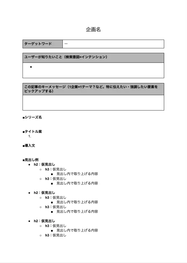 取材前に用意した簡易版の構成案と、取材で実際に伺ったお話の内容をもとに、正式な構成案を作成します。案件やテーマによって構成案の粒度は異なりますが、原則「h3見出し」レベルまで要素を整理し、どのような文章展開に落とし込むかを記載します。